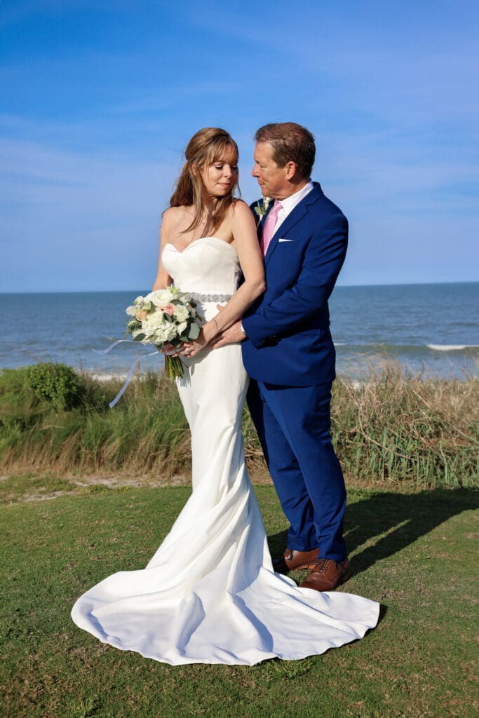 The groom’s deep blue suit stood out beautifully against the coastal landscape, while the bride’s sleek gown moved effortlessly in the ocean breeze. The soft light wrapped around them in a way that felt calm and unforced — exactly what we aim for during every coastal Florida wedding we photograph.