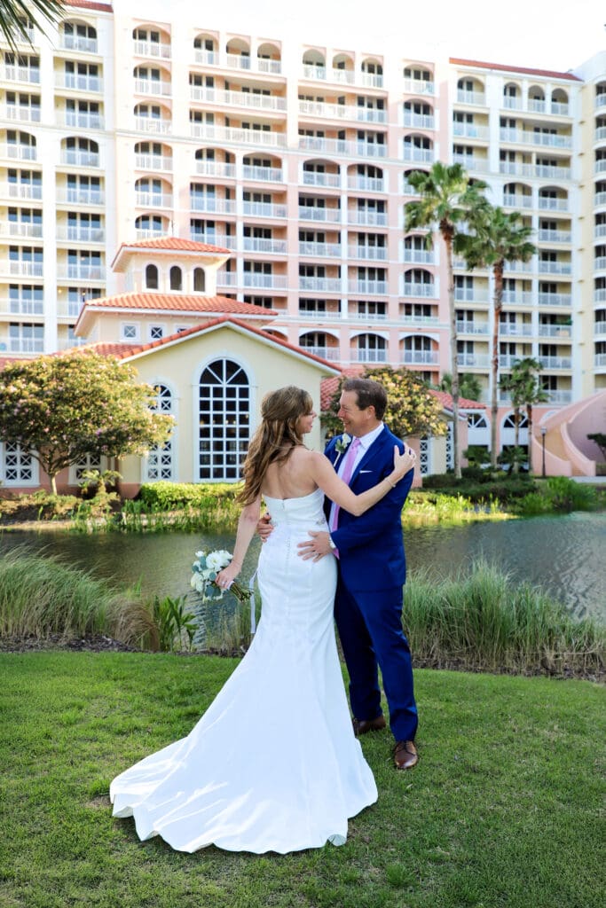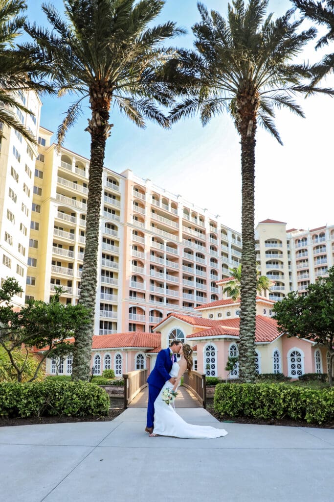One of the things we love most about a coastal Florida wedding is how effortlessly the scenery elevates the experience. Tall palm trees framed the walkways, while the venue’s blush and cream tones paired beautifully with the bright blue sky. The architecture added a classic, old-world feel that complemented the coastal surroundings without overpowering them.