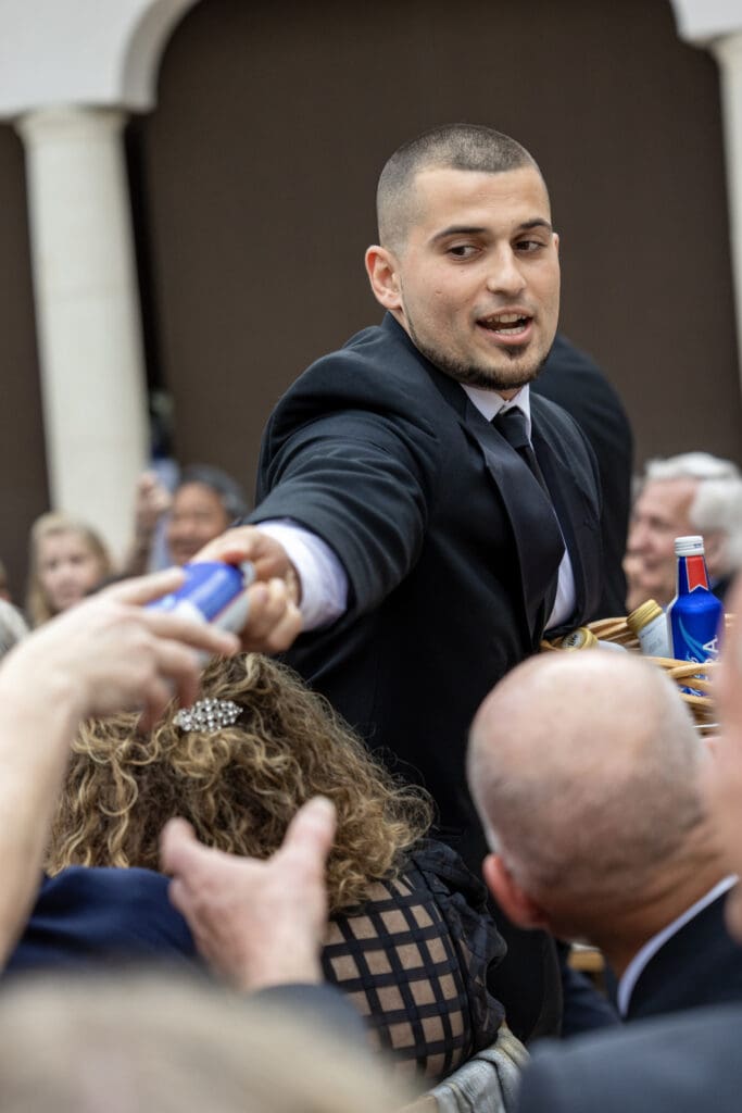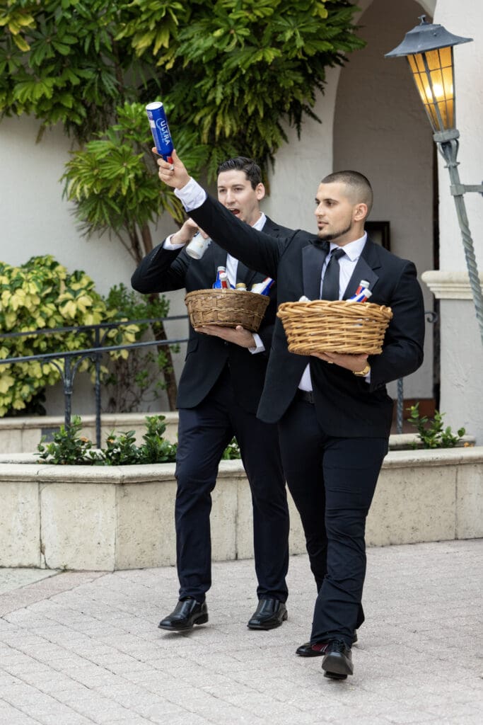 A wedding beer run (often called the “beer man” moment) is when one or more groomsmen walk through guests during the ceremony handing out beers—purely for fun and surprise.